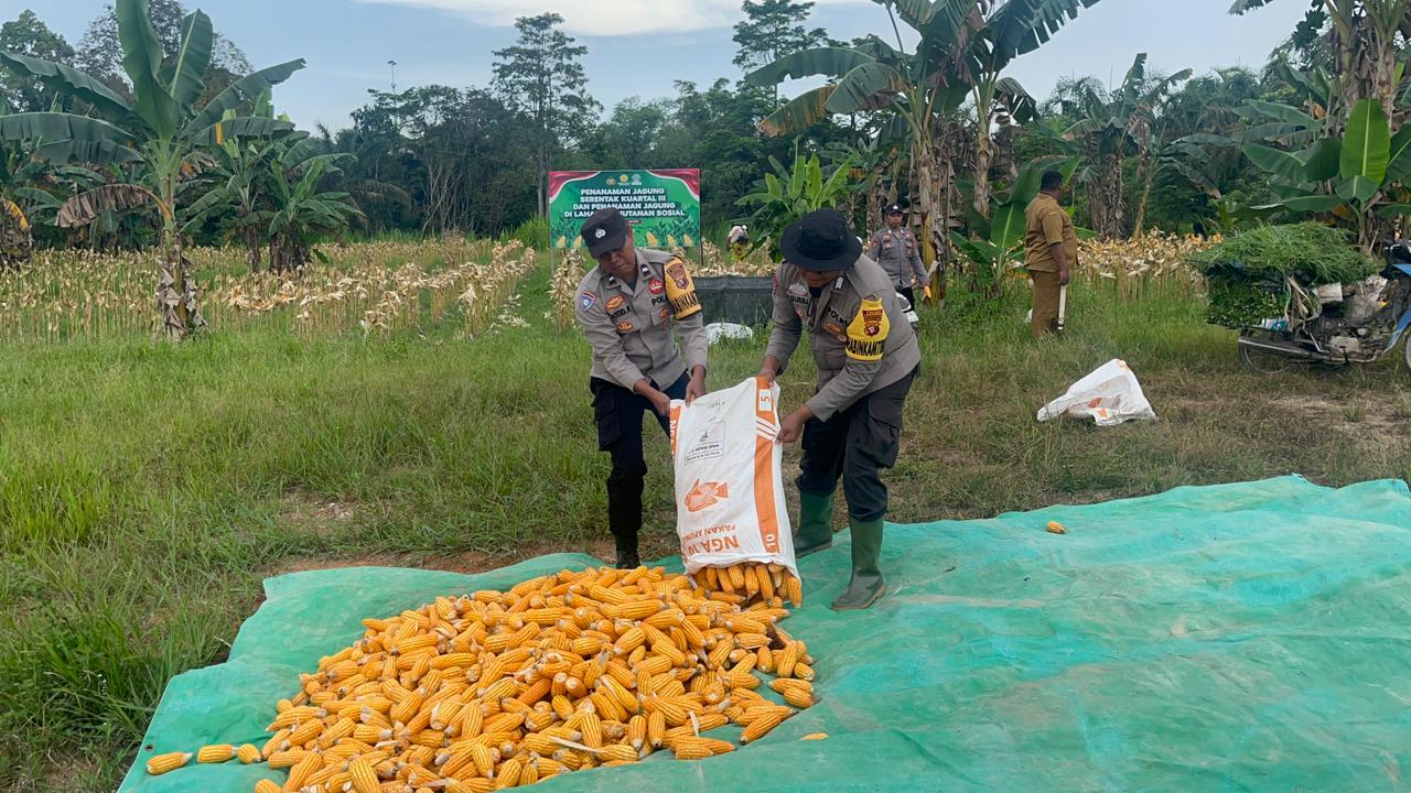 Polres lamandau – Bhabinkamtibmas Polsek Bulik Melaksanakan kegiatan Panen Tanaman Jagung bersama di lahan Fasilitas umum milik pemerintah Desa Bumi Agung Kec. Bulik Kab. Lamandau, Kegiatan ini merupakan bentuk dukungan dan kedekatan Polri dengan Perusahaan dan Masyarakat khususnya para petani, Selasa (14/10/25) Pagi.