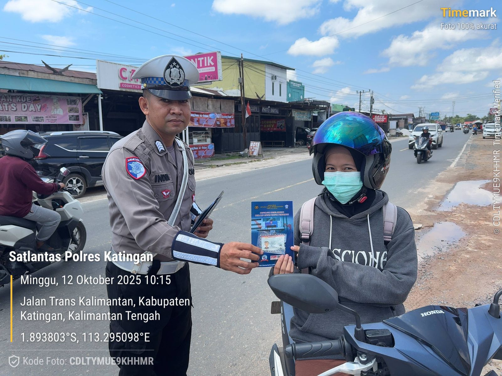 Personil Satlantas Polres Katingan sebagai anggota preemtif bergerak turun ke Jalan untuk meninformasikan kepada pengendara melalui pembagian brosur, untuk menciptakan keamanan dan keselamatan berlalu lintas.