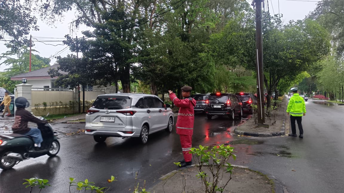 Dengan menggunakan jas hujan, para personel tampak sigap mengatur arus kendaraan agar tetap lancar meski kondisi jalan licin dan jarak pandang berkurang. Kegiatan pengaturan lalu lintas ini dilakukan di beberapa lokasi strategis seperti persimpangan jalan utama, depan sekolah, dan kawasan perkantoran.